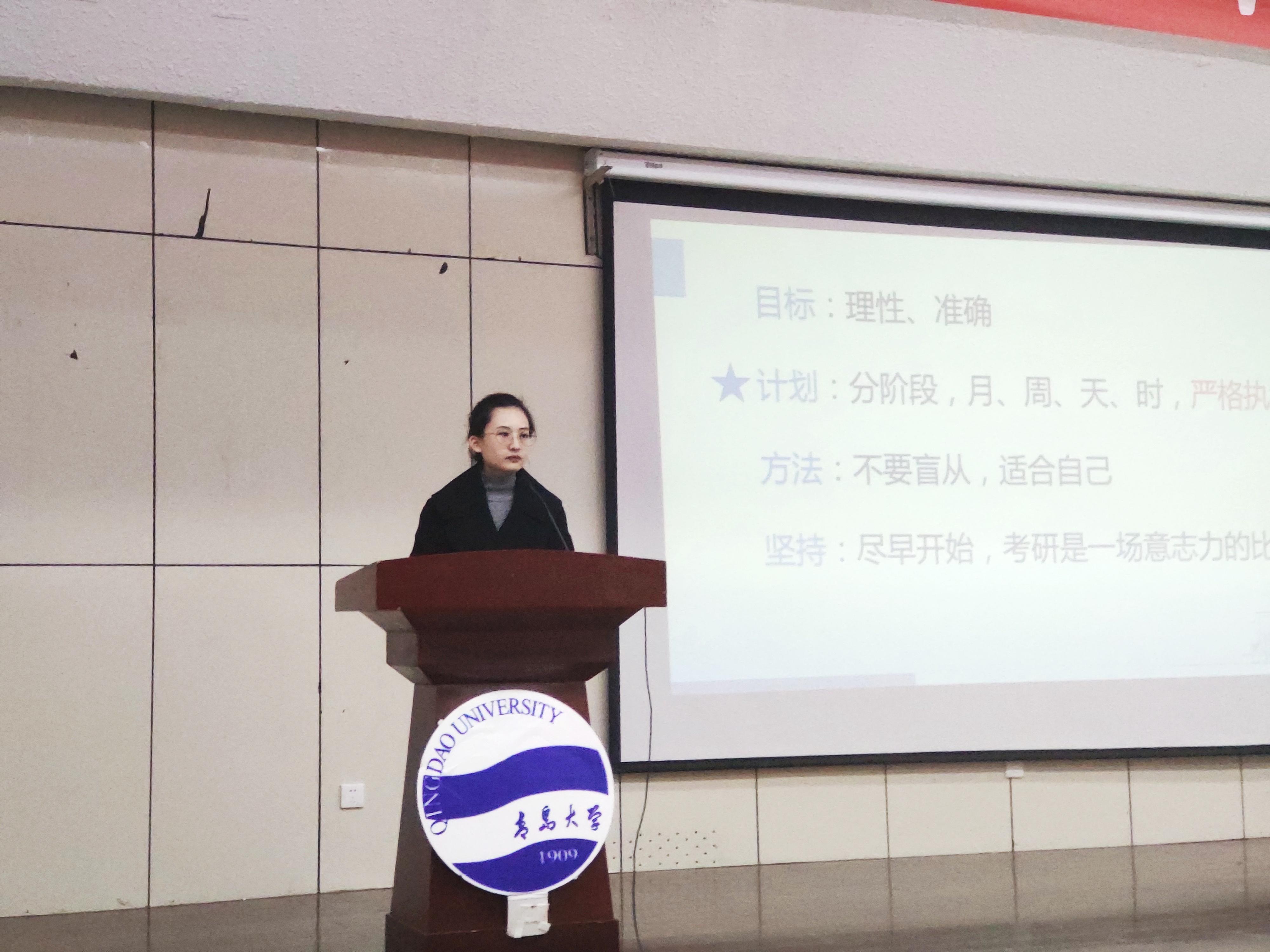 的曲奕诺围绕“脚踏实地,专注于向”进行分享,她从目标、计划、方法和坚持四个方面谈起。目标要理性准确;计划要分阶段,月、周、天、时都要统筹谋划,更要严格执行;方法上不要盲从,要适合自己;坚持上要尽早开始,要坚持到底。同时结合自身考研经历对报考学校选择、跨专业择校等问题进行分享。