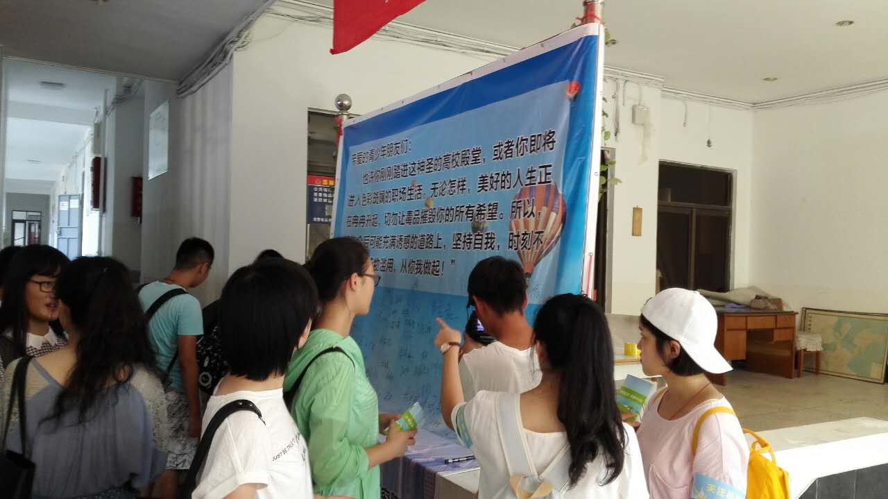 讲座前后,同学们纷纷在“拒绝药物滥用,从你我做起”的宣传栏上签名,表达健康生活的美好愿望和信心。