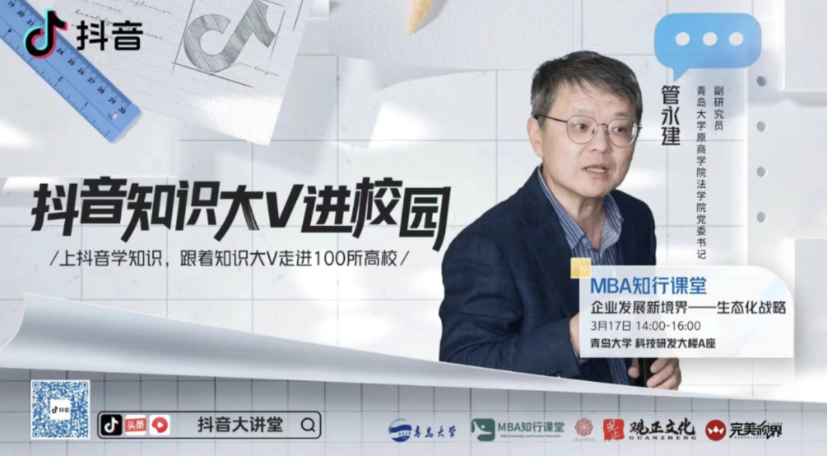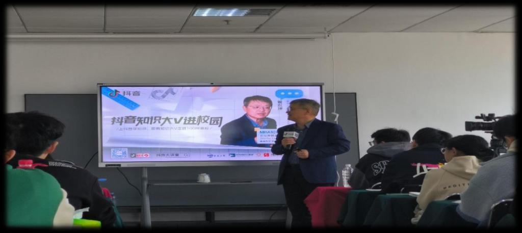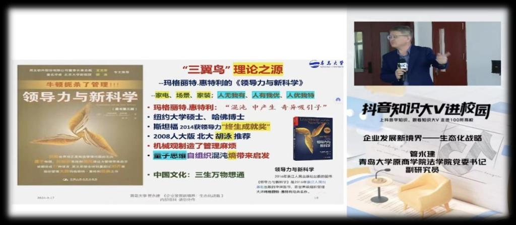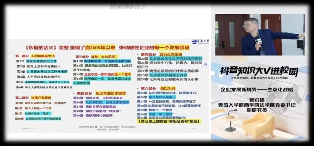 研发楼A座705展开,参与课程的有主讲人管永建老师、研习班的同学及直播间来自五湖四海的朋友,我们还非常有幸邀请到海尔大学原副校长胡春梅老师作为主持人。课程采取抖音直播线下互动的新颖上课方式。“抖音知识大V进校园”是由抖音平台发起的知识分享活动,它邀请来自不同领域的知名人士如作家、艺术家、科学家等,进入高校与学生们面对面交流,分享他们的专业知识和人生经验,本次活动管老师为我们讲解海尔生态战略的知识。