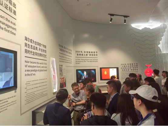 历尽天华成此景,人间万事出艰辛。从海尔生态展大厅步入二楼海尔文化展展厅,移步换景,慢慢揭露着海尔的创业史、奋斗史以及发展史。自海尔“人的价值最大化”及“企业是人文化是魂”的用人思想与六大战略开始,企业初期发展、企业品牌打造思想、企业管理模式、创新发展理念、多元发展品牌、“人单合一”理念等凝聚海尔成长精华的关键元素都由讲解员为我们娓娓道来。无论是智能互联的家电产品,还是独创的“人单合一”管理模式,海尔都展现出了持续创新的能力和决心。其生态化战略更是充分发挥员工的能力,将企业员工价值最大化,并直接服务于客户,打造高效互联、无限进步的企业生长潜能。先行先试,实干兴业。海尔人的骨子里沉淀着“自以为非”“真诚到永远”“创新求是创新”以及“诚信、责任、奋斗、卓越”的精神基因;战略转型,生态发展,今天的海尔不断创造新的奇迹,并在超越发展的路上再一次出发。