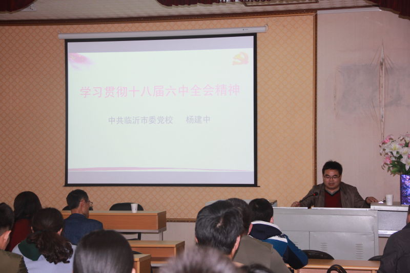2017年4月7日下午,“山东省高校思想政治理论课特聘教授”、临沂市委党校副校长、杨建中教授在金瓶梅 第一会议室,为学院教师、全体研究生和2016级本科生做了题为“学习贯彻十八届六中全会精神”的报告。报告深入浅出、引经据典、联系实际,收到师生的热烈欢迎。