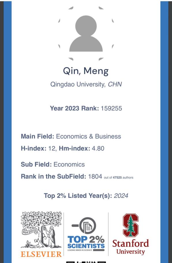 近日,美国斯坦福大学在爱思维尔(Elsevier)出版集团官网上发布了2024年全球各学科前2%科学家榜单(第七版),金瓶梅秦梦副教授入选榜单,并位列全球经济学子学科排名1804位(总47525人),实现学院在国际学术领域新的突破。