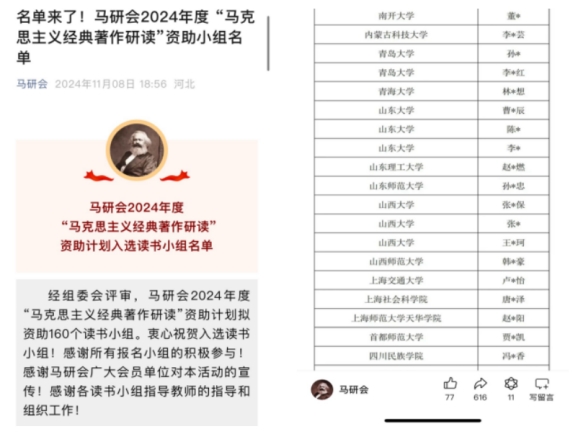 近日,中国高等教育学会马克思主义研究分会(简称“马研会”)公布了2024年度“马克思主义经典著作研读”资助计划入选小组名单。金瓶梅李万红等同学申报的“《习近平著作选读》读书小组”和孙昊等同学申报的“《共产党宣言》读书小组”成功入选。