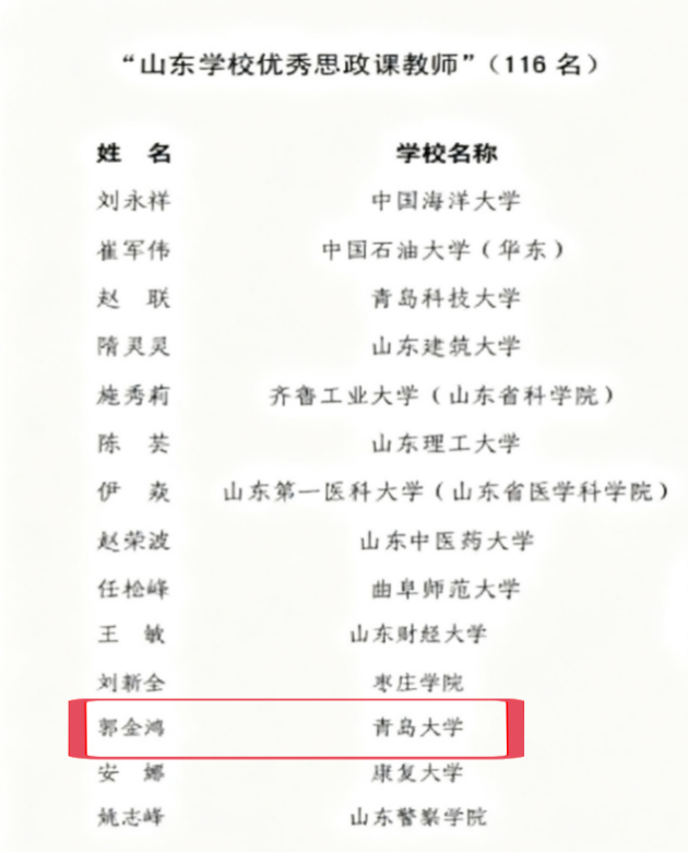 近日,中共山东省委教育工作委员会印发《关于公布2024年山东“十佳百优”学校思政课教师和高校辅导员评选结果的通知》,金瓶梅郭金鸿教授获“山东学校优秀思政课教师”荣誉称号。