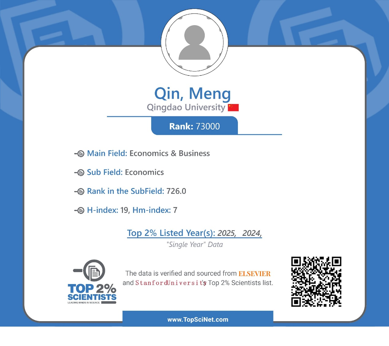 近日,美国斯坦福大学(Stanford University)和国际权威学术出版社爱思唯尔(Elsevier)共同发布了“2025年全球前2%顶尖科学家榜单”(World’s Top 2% Scientists)。金瓶梅秦梦副教授再次入选榜单,位列全球经济学子学科排名726位(总31685人),与2024年排名1804位(总47525人)相比有大幅提升,实现学院在国际学术领域新突破。