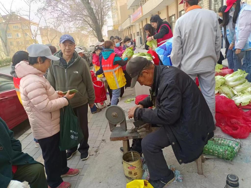 志愿者有条不紊地分工合作,分发暖心的白菜,传递着爱与温暖居民们也井然有序地领取白菜,静静地等候大爷用最传统的手艺,为他们磨刀磨剪子。欢快的交谈声,有序的搬运声,机器的运转声,温暖的道谢声,交织在一起,演奏出一曲冬日欢歌。