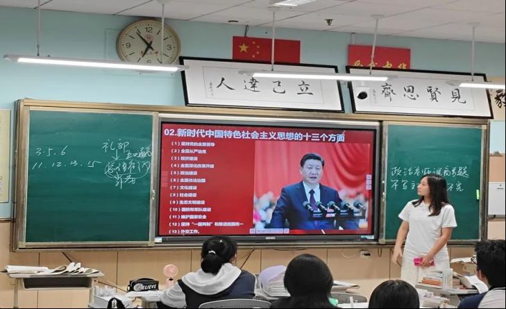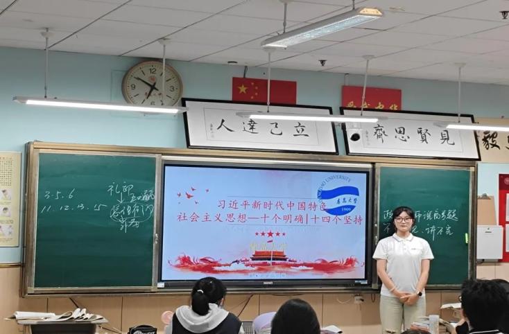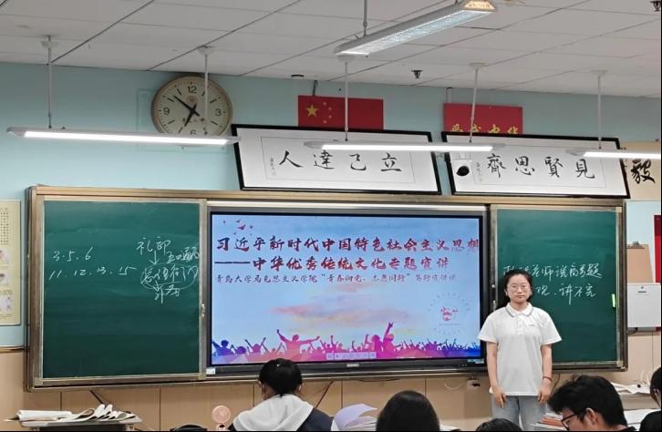随后,宣讲团成员开展了主题宣讲,旨在将党的创新理论知识与社会实践紧密结合,向高中学子传递深刻的思想内涵。宣讲过程中,张民赫同学对青岛九中的前身历史进行了阐述,并以此为契机,深入探讨了青少年如何继承和发扬礼贤精神的重要性;在此基础上,王石同学巧妙地运用英雄感人故事,激励同学们继续传承红色基因,弘扬优良传统;陈颖雪同学与薛凯儒同学则以事迹与理论相结合的方式,生动讲解了中国特色社会主义的内容与实践,解读了习近平新时代中国特色社会主义思想的“十个明确”“十四个坚持”“十三个方面成就”;最后,金映瑞同学结合青岛地方非遗文化,使同学们对中华优秀传统文化有了更为深入的理解。整个宣讲过程严谨有序,理论与实践相结合,为高中学子提供了一次宝贵的学习机会。