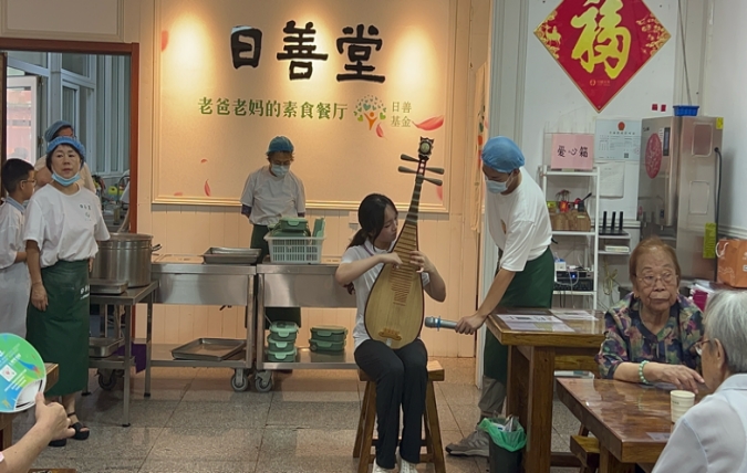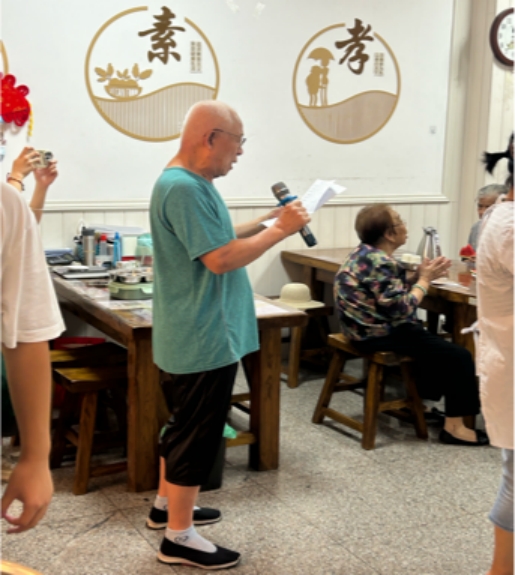 团队成员进行了精彩的文艺汇演。刘佳岳同学指尖轻拨琵琶弦,演奏《琵琶语》和《枉凝眉》两首曲目,如珠落玉盘,清脆悦耳,仿佛带领众人穿梭于古典诗画之中。同学们则以深情并茂的诗歌朗诵,颂扬了敬老爱幼的传统美德,字字句句,饱含温情与敬意。日善堂的老人们更是风采不减当年,他们或引吭高歌,歌声里藏着岁月的故事;或轻吹竖笛,旋律间流淌着对生活的热爱;更有大合唱《我和我的祖国》,激昂的歌声汇聚成海,展现了跨越年龄界限的团结与热爱,让这方小小的天地充满了无限温情与美好。