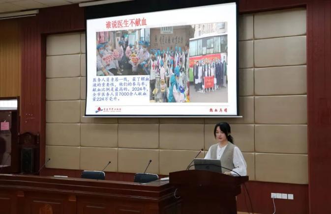 笃行宣讲团成员刘佳岳详细讲解了科学献血的重要性、献血的规范化流程及注意事项,以及青岛市针对无偿献血者所制定的优惠政策等多个方面。她结合自己的献血经历,深情讲述了无偿献血在挽救生命、促进社会健康方面所发挥的重要作用,让在场同学深受触动。